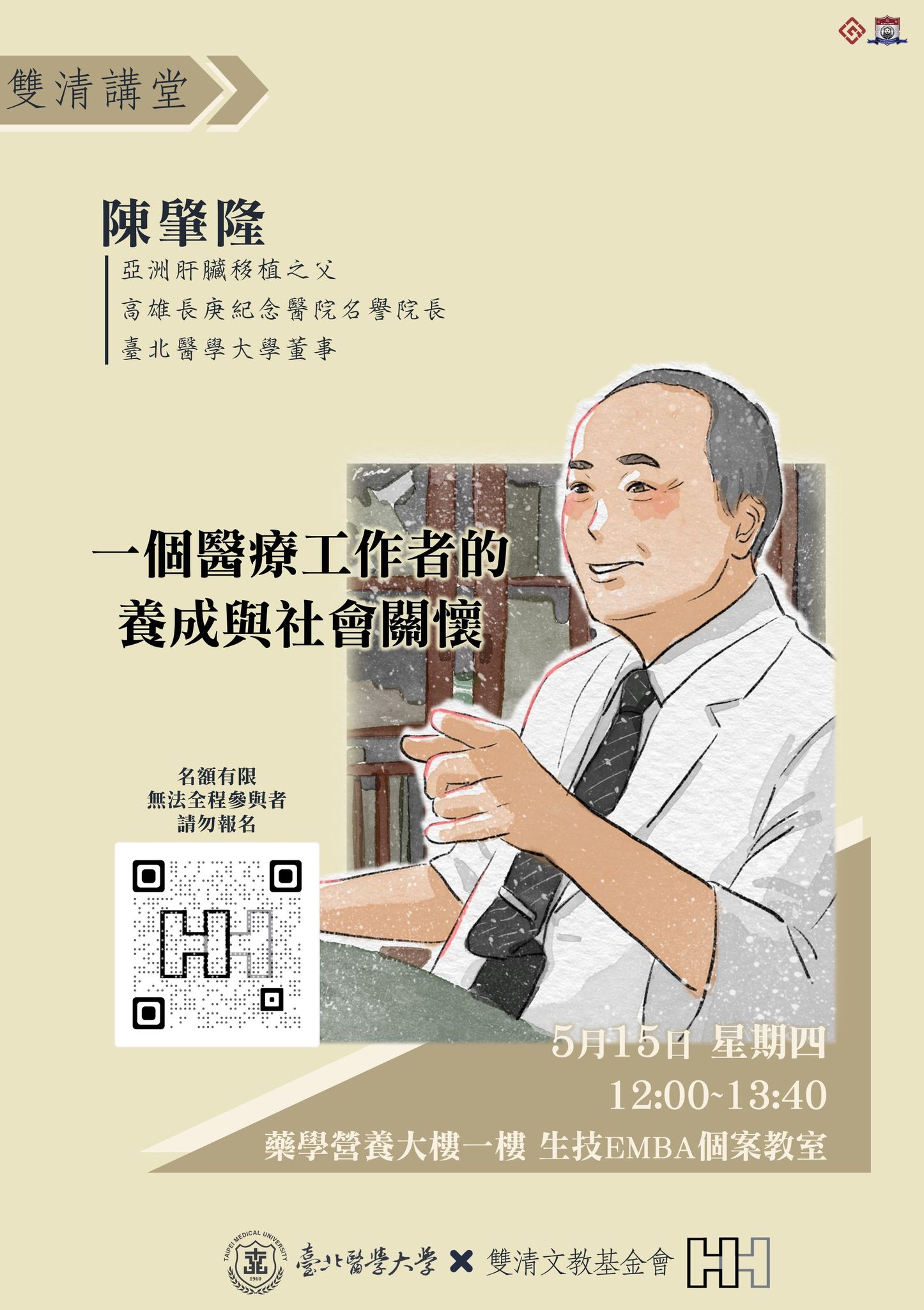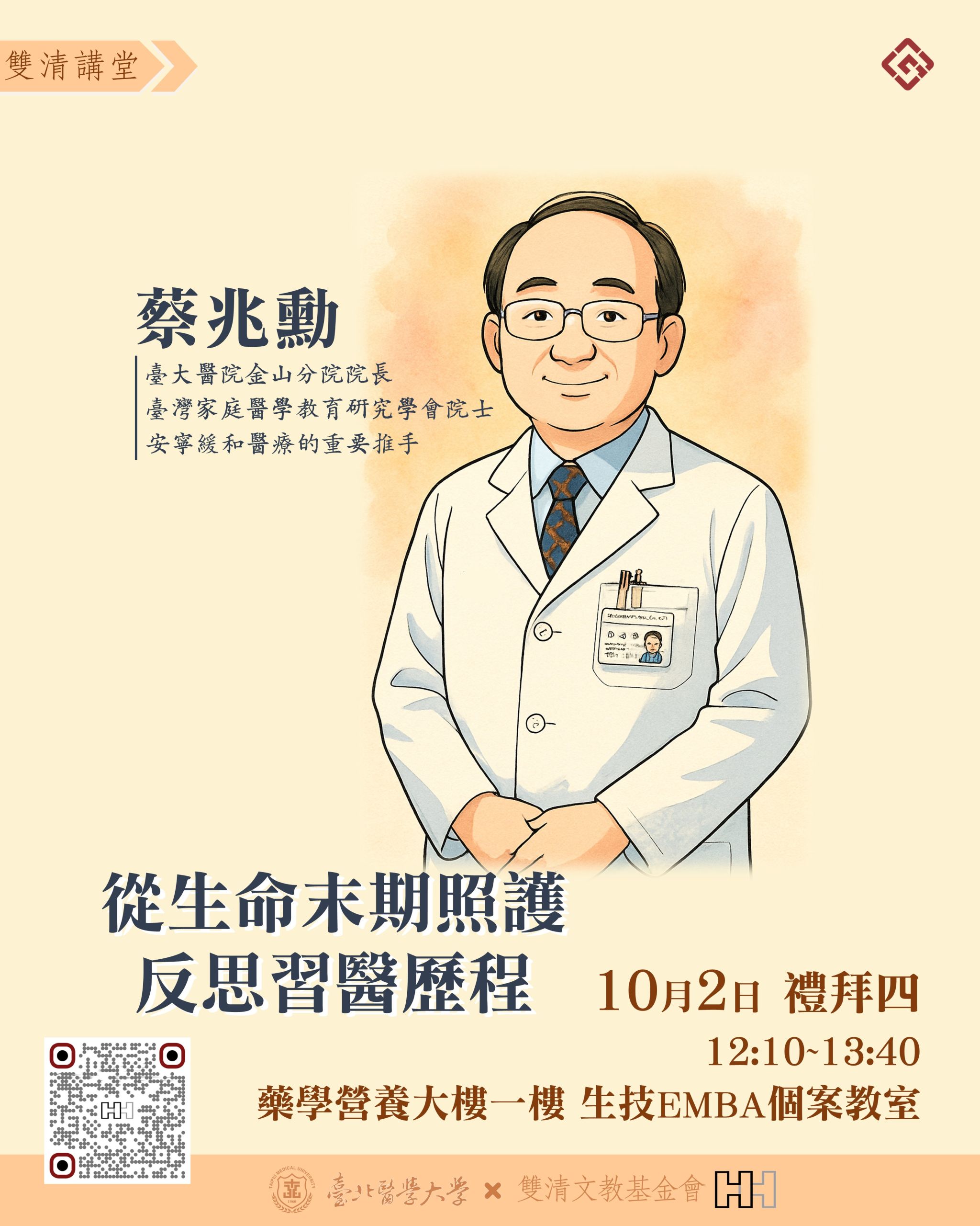 臺北醫學大學與雙清文教基金會自本年度(104)起共同主辦「雙清講堂」,希冀藉由講座的互動交流持續深化人文藝術校園,促進醫學與人文領域之多元對話,並彙集精彩內容輸出為線上節目與文字出版,持續推廣雋永的人文藝術典範。
